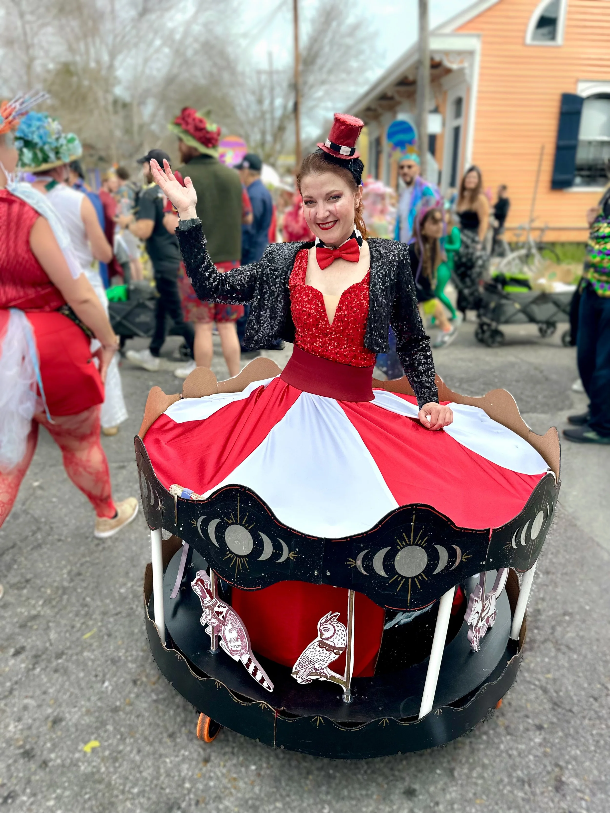 Through that lens (see what I did there?), I’ve worn many hats: costumer, actor, English tutor, barbershop quartet singer, crafter, cellist, rock cellist, retired cellist, theater nerd, fire eater, interstellar bus driver, swing dancer, possum smuggler, cat lady, parading unicorn, bartender, fancy bartender, retired bartender, bone collector, bone retailer, burner, big gay easter bunny, sobriety superstar, crime fighter, wildlife rehabber, lap swimmer, corn, Noisician, Carousel, filmmaker, Hello Kitty collector, queerdo, dancing opossum, covid-era local celebrity, and Proposal Expert Who Has Never Been Proposed To (What can I say? I’m married to my job. Holla at me, Lifetime Movie Network!).
