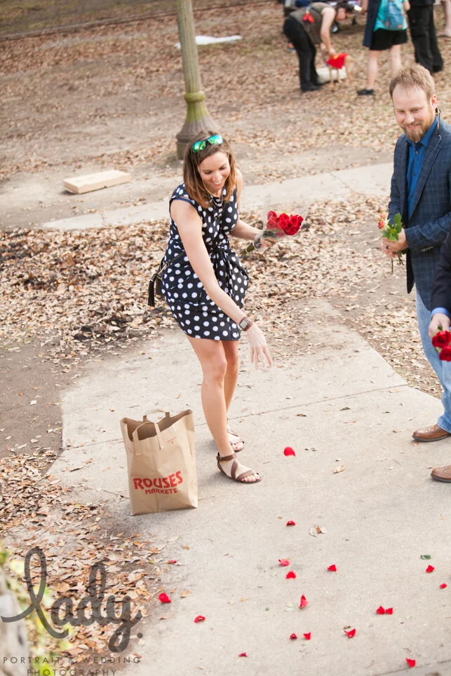 We had KIneca request her uber take her to Morning Call in City Park and we had a friend waiting there to intercept her and send her to the bridge. Everything was going according to plan. Until Kineca accidentally requested the Uber take her to Morning Call in Metairie! We couldn’t figure out why it was taking so long for her to get there. Poor Ray was so nervous and the waiting was only making it worse! Once she realized she was going to the wrong location and corrected course, we had her share her location with Ray. The Uber had no idea where Morning Call was and dropped her off a half-mile walk away on the wrong end of the park (Damn you, Uber!!)! With her location shared with Ray’s phone we saw that we would need to change which side of the bridge he waited on and drop rose petals on the opposite walkway!