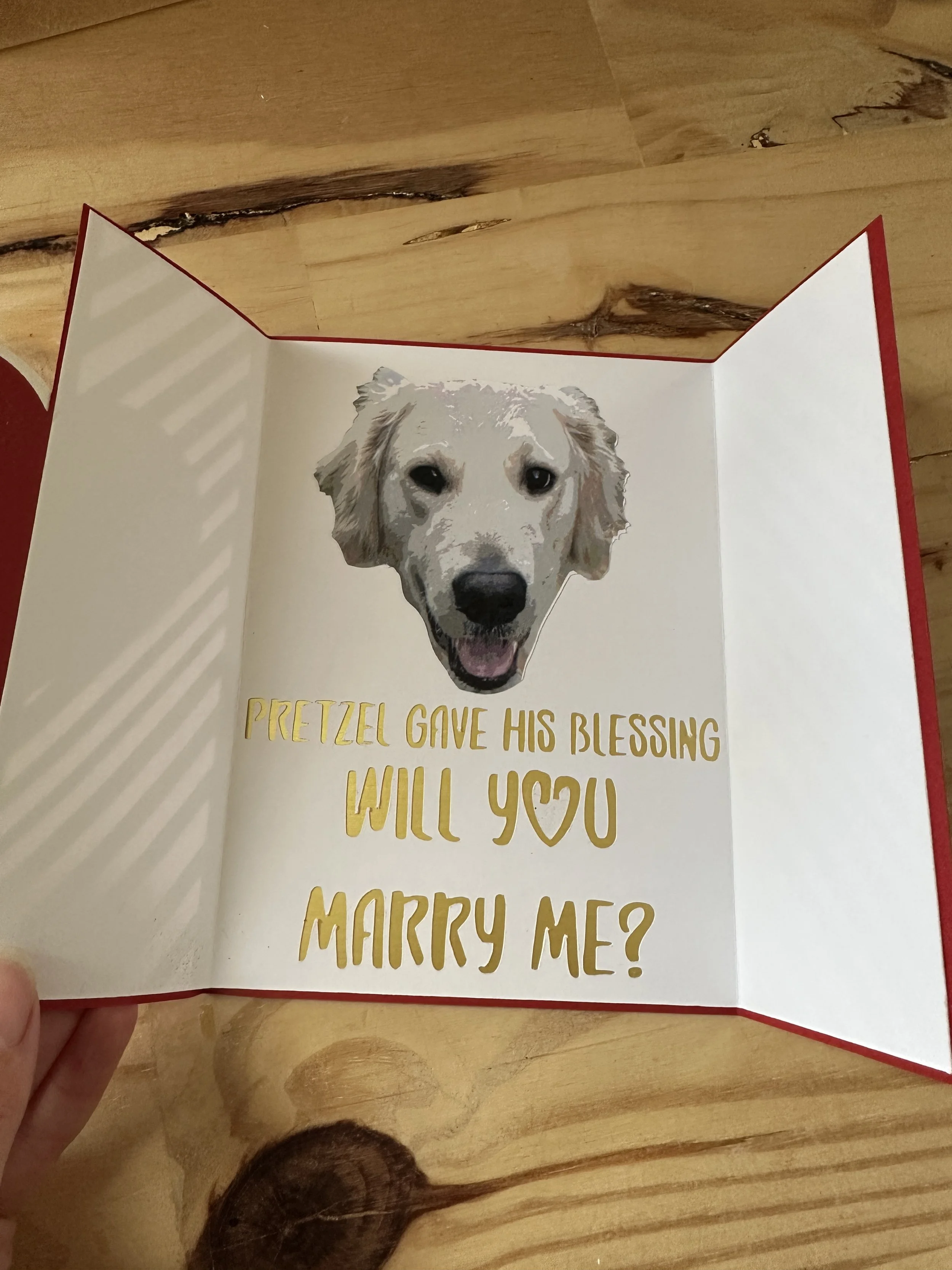 As a mother of 4 fur children, I was all for this idea! I had him send me some photos of Pretzel and he asked I make the text in the card “Pretzel gave his blessing. Will you marry me?”