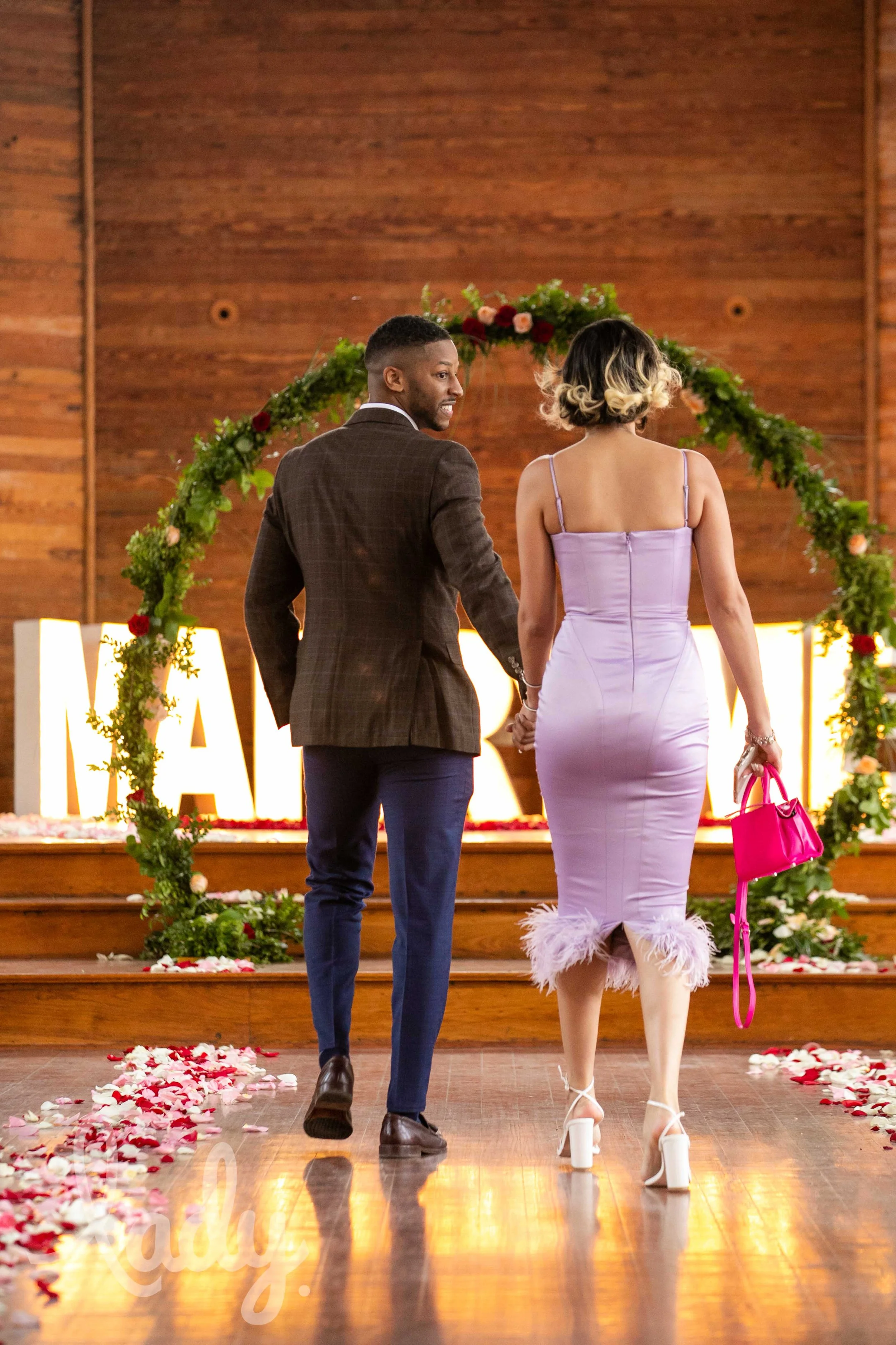 It’s a good thing, too, because I made that poor guy move the letters like 4 times. 😂 Trey said that he wanted the letter visible through the arch and we had to try a number of different positions on both the letters and the arch to make that possible. It was impossible to get them visible from the door but they would be once they got closer to the stage. I was being SO meticulous about the setup. My perfectionism was off the charts with it being the first time at this venue. Perfectionism isn’t the best trait a lot of the times but in proposal set it can come in pretty handy!