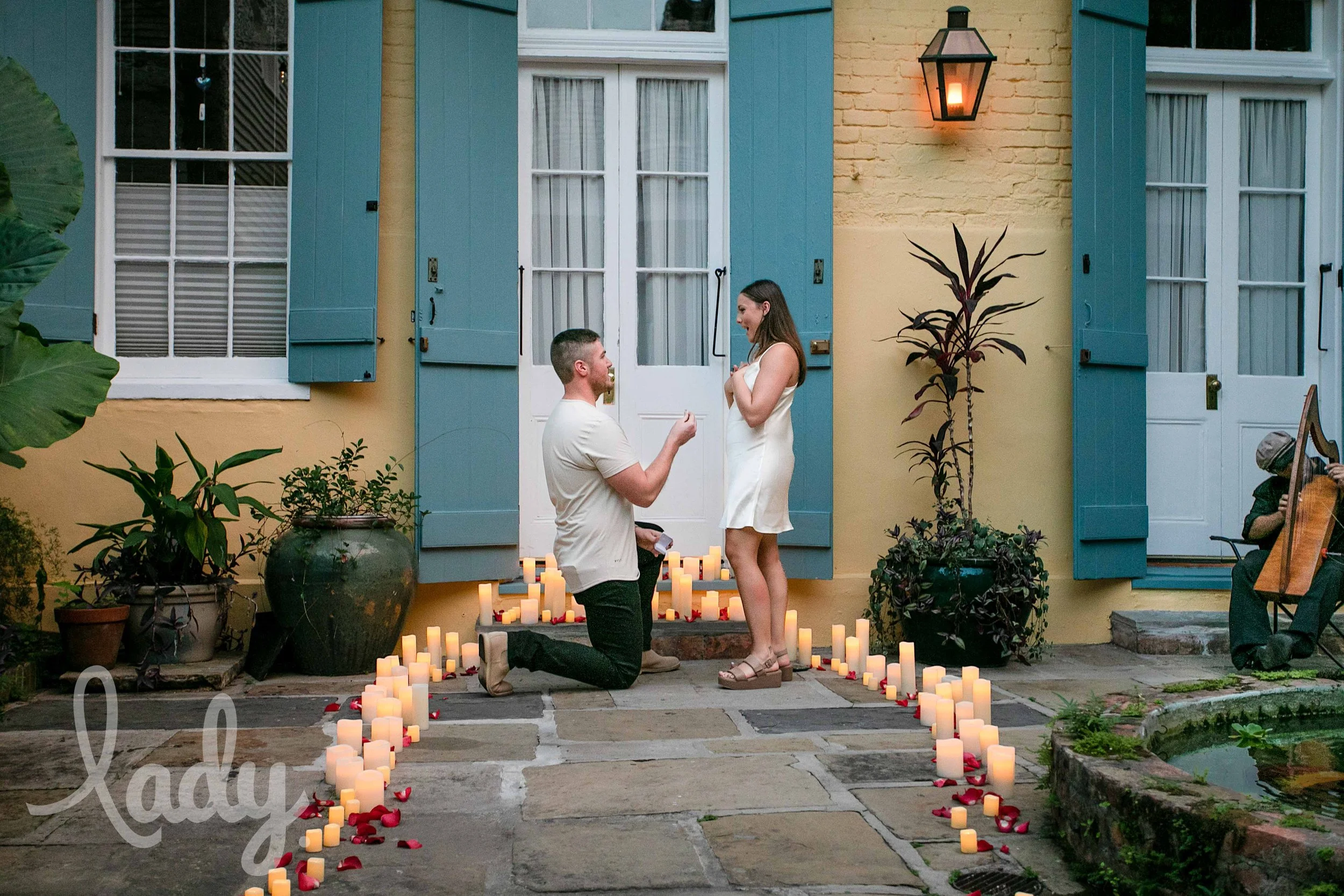 London’s proposal to Kelsi was the first in a private French Quarter courtyard! We dialed the romance up to 11 with candles, rose petals, a harpist, and a carriage with champagne waiting outside when they were done. I even got the ring ahead of time to put in the candle display!