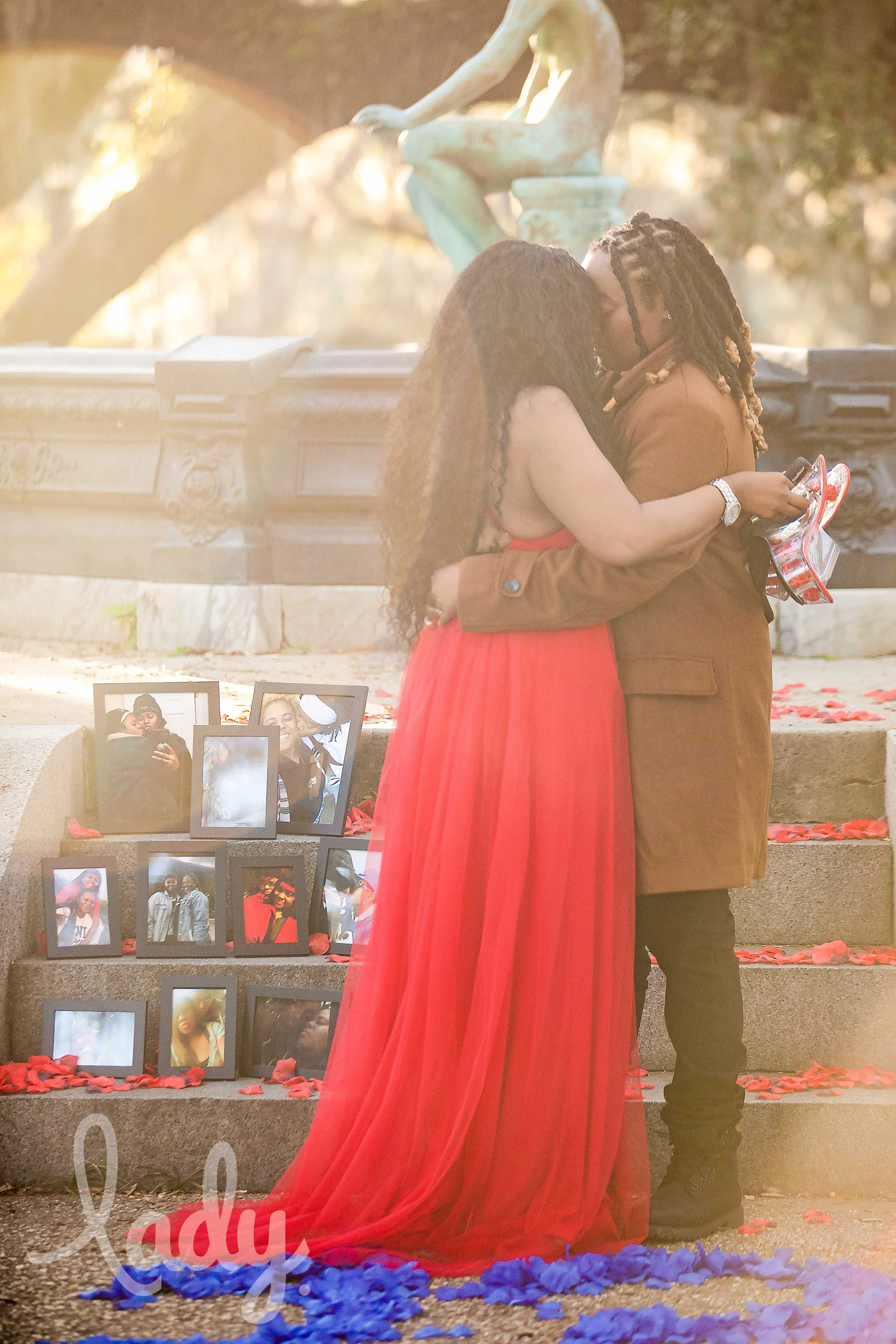 DeiJuan’s mom was sending texts to Cocoa of what DeiJuan was planning to wear. The photographer I had recommended works with a lot of dancers and performers who are wearing rather revealing outfits in their photos. And while DeiJuan would absolutely sley in the outfit she had on, that was definitely not the vibe for the proposal! Cocoa got DeiJuan’s mom to suggest she wear this killer red dress she has and bring the other outfit along to change into if there was time. They were going to be in a public space, afterall.