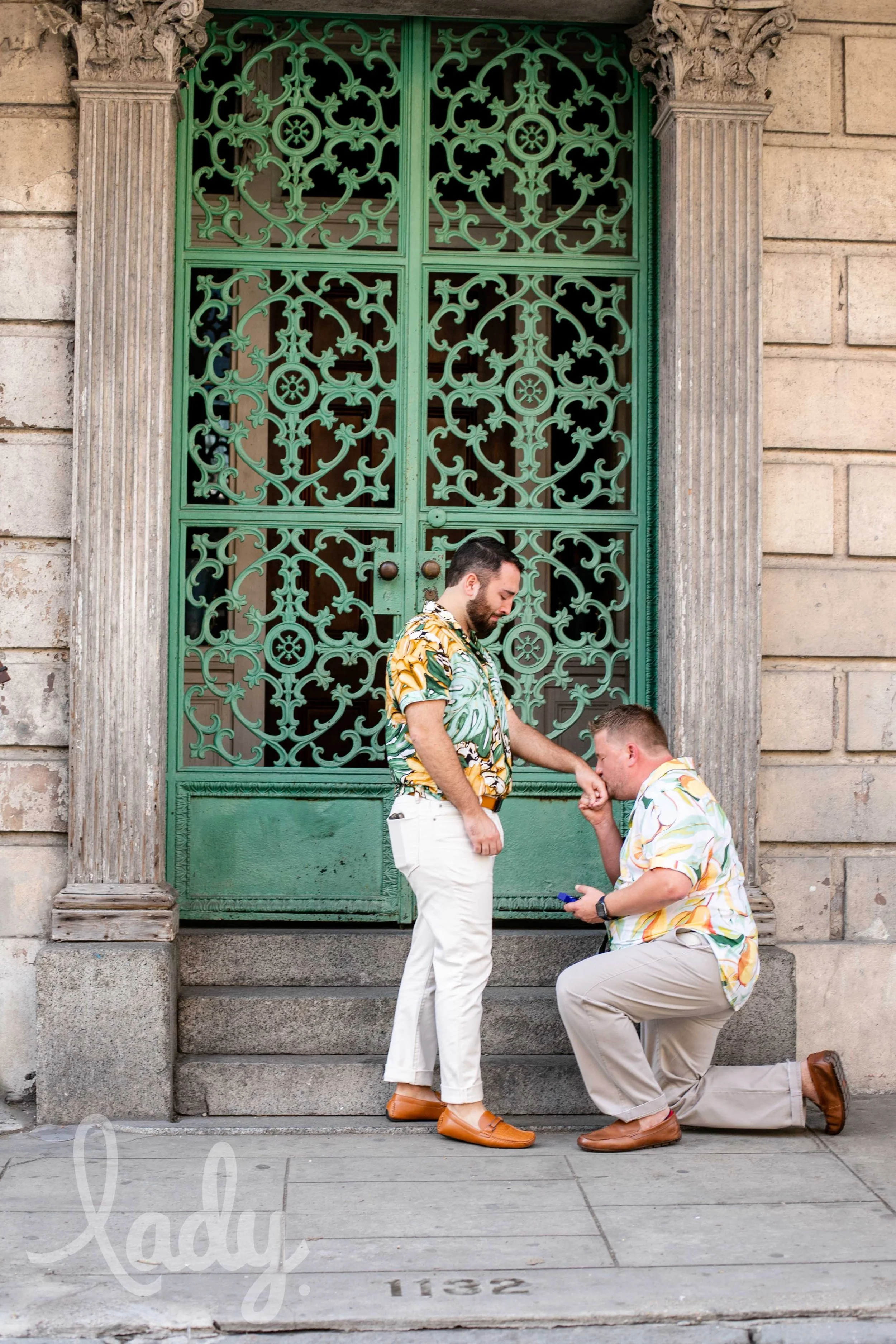 After looking at locations all over the city and watching Joseph struggle to pick the right one, I showed him my favorite green door in the Quarter. It’s just 2 doors down from a famed haunted mansion and Landon is super into the paranormal. It’s easy to find but off the beaten path a bit so it would be private, covered so in the event of rain we wouldn’t need to move elsewhere, and -possibly the best part- I’d never done a proposal there before!