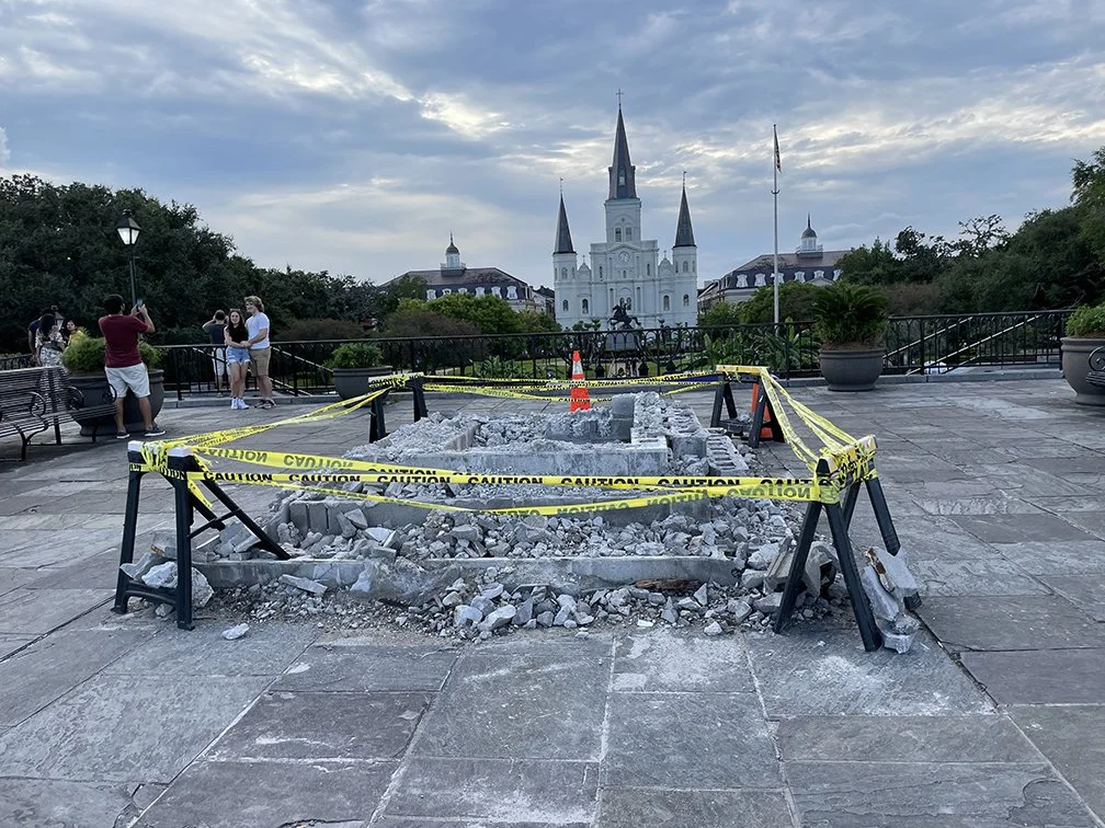 One of my flower tossing assistants lives a few blocks from Jackson Square so I asked her to go check the location on her way home from work on the day of the proposal. She sent me some photos and the rubble pile was gone! What was left behind was a recessed area with some rubble remnants bordered by caution tape that was attached to saw horses.