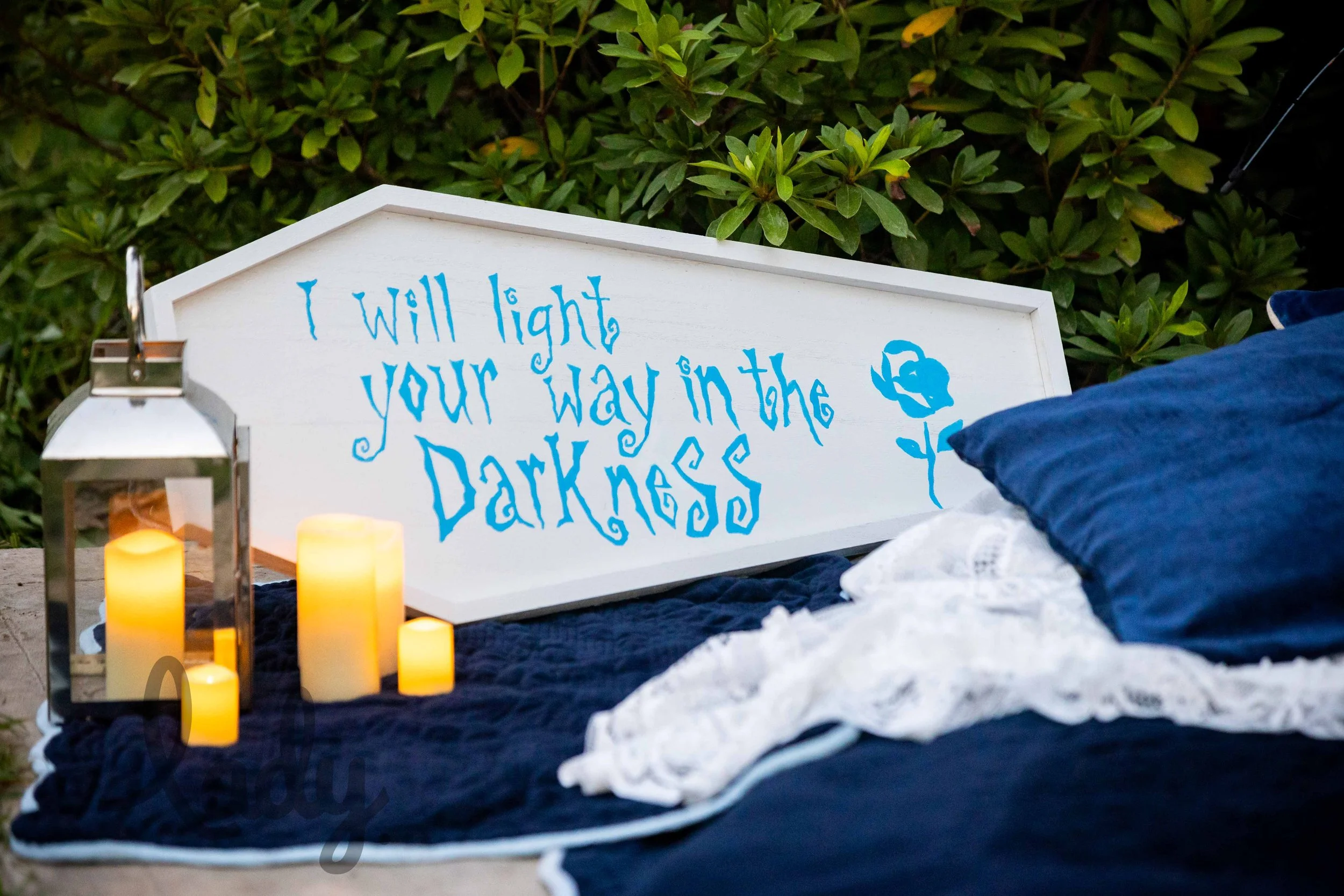 Halloween bizarrely décor hit shelves in July this year. So I was able to easily find what I was after. I picked up a wooden coffin-shaped sign, painted it white, and used a dusty blue chalk marker hand lettered (in the Corpse Bride font I had to go digging for) the first line of Victor’s vows in the movie: “I will light your way in the darkness”. I crossed my fingers that it would be a hit and not a miss!