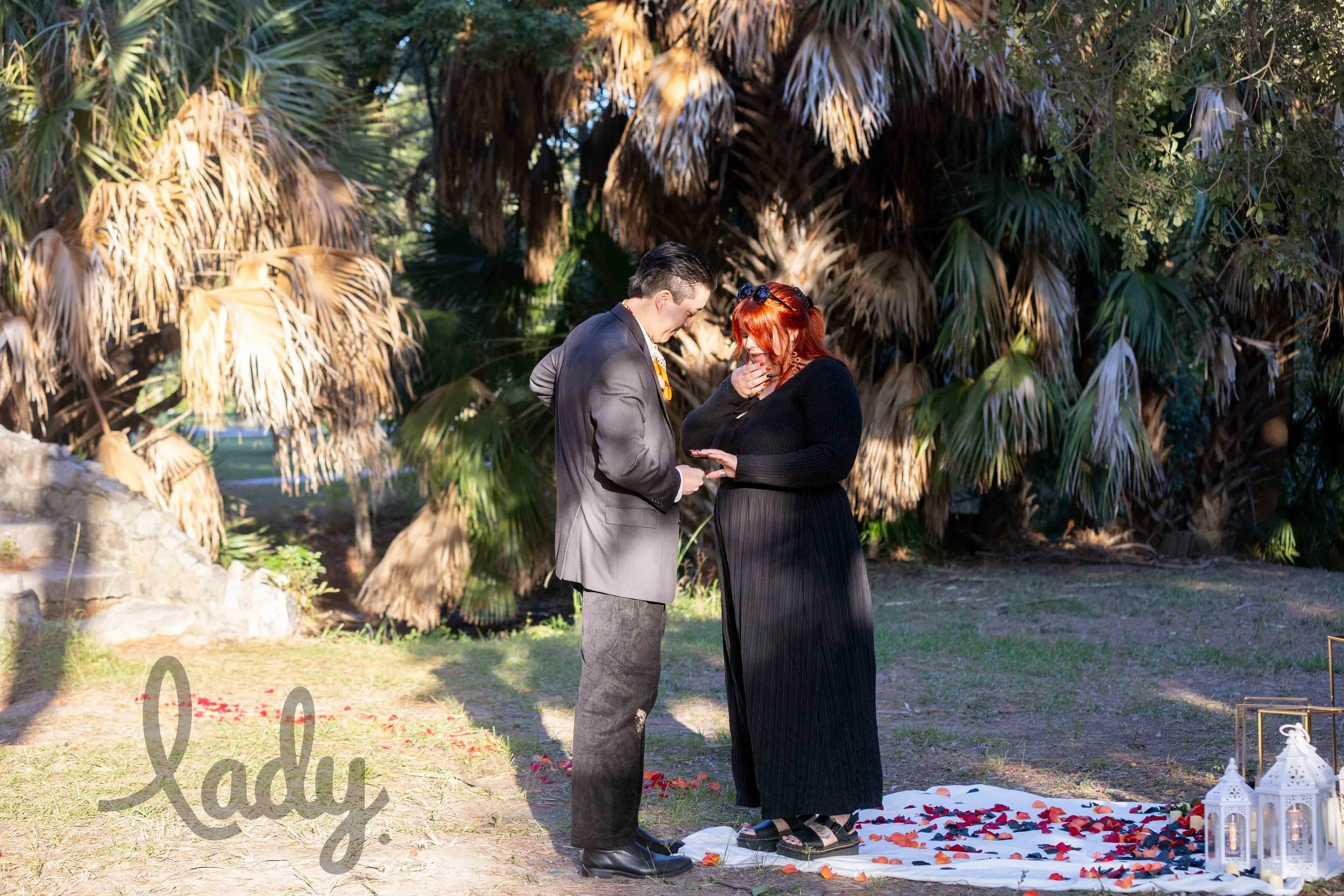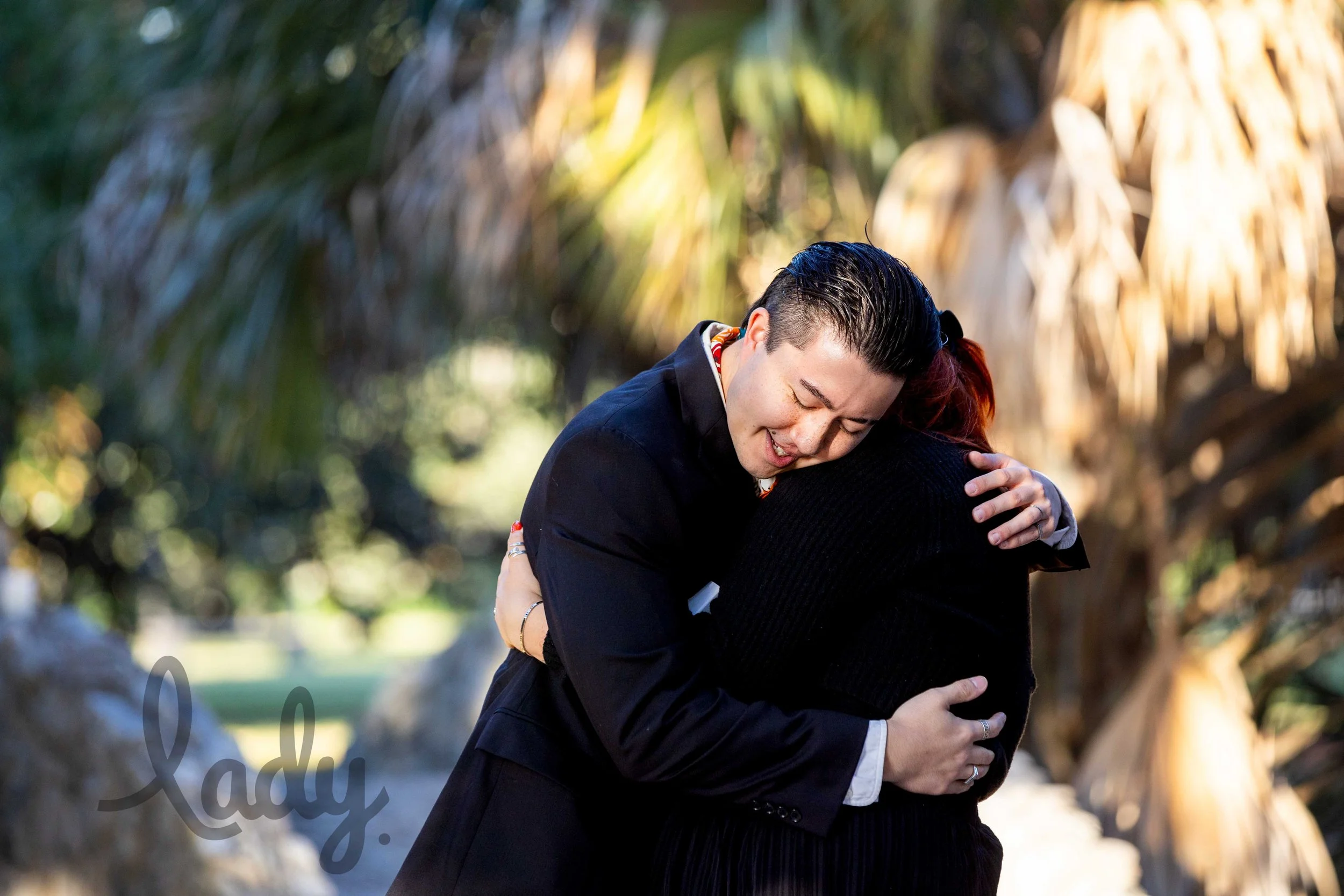 Lighting was a bit of an issue as I had feared with the setting sun hitting Evan directly at certain moments. But because I had placed everything under the tree where I was fairly certain there would be shade at the time of the proposal, the photos ended up looking lovely. Cher put her hand to her heart and gasped when she saw the setup. Evan led her to it and she dropped her purse to the side of the tree. They hugged and danced to the music for a moment. I heard her say "it's my favorite song!". Then he carefully took a knee. She was saying yes before he even took out the ring. And when she saw the ring, she jumped up and down and squealed "yesyesyesyes!".