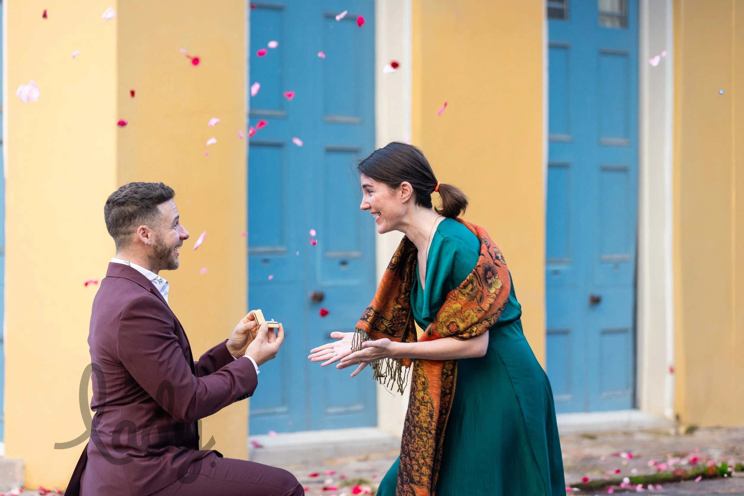 As the song reached its crescendo, the petal rain began. Hail, caught in the magic, momentarily lost himself until he saw Victoria's familiar face (her face is all over a viral instagram video I posted last year!), a subtle reminder of the grand gesture he was about to perform. He knelt, and the world seemed to pause, everyone and everything except for the rose petal rain and Kristina’s resounding “yes” echoing through the historic neighborhood.