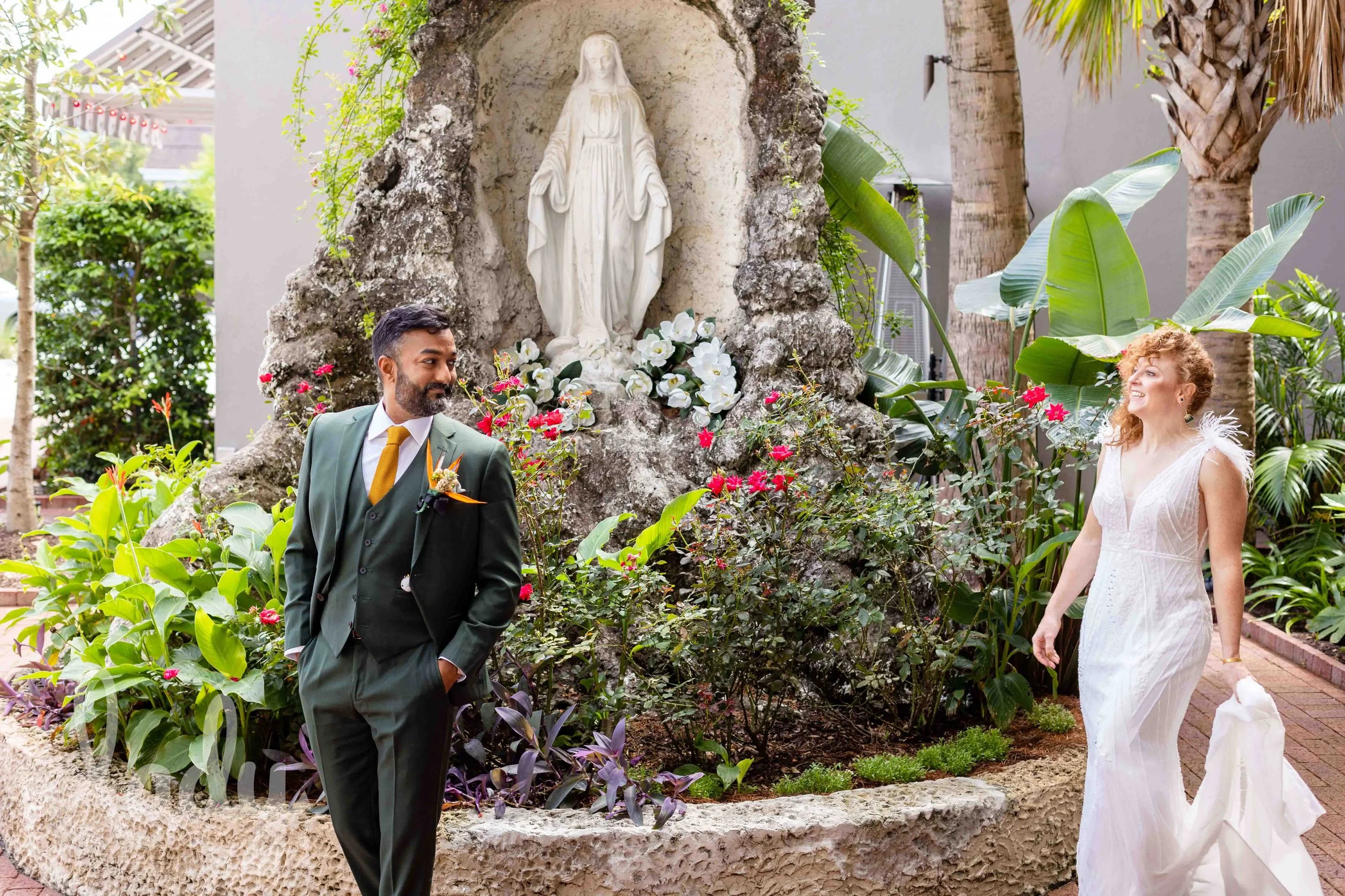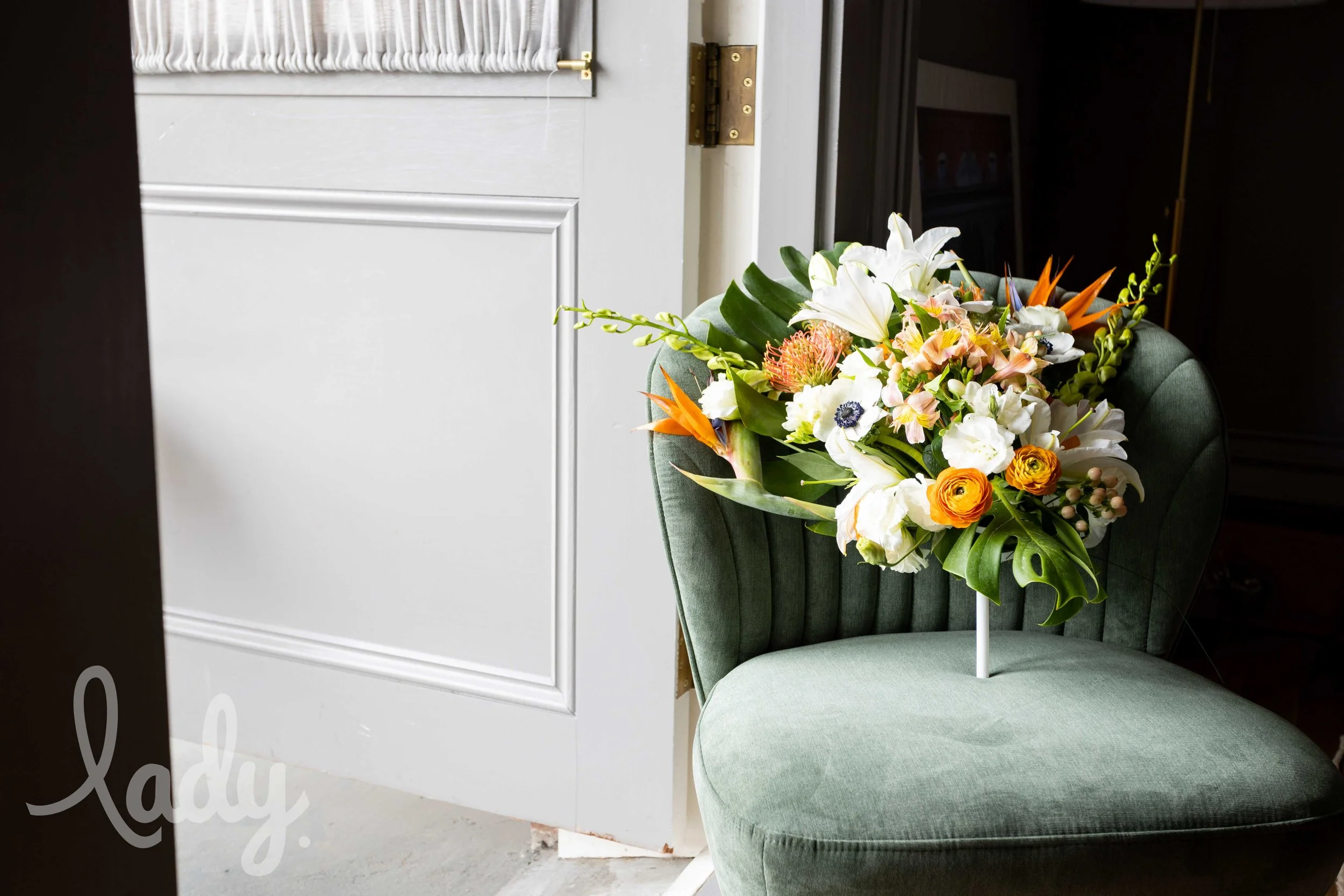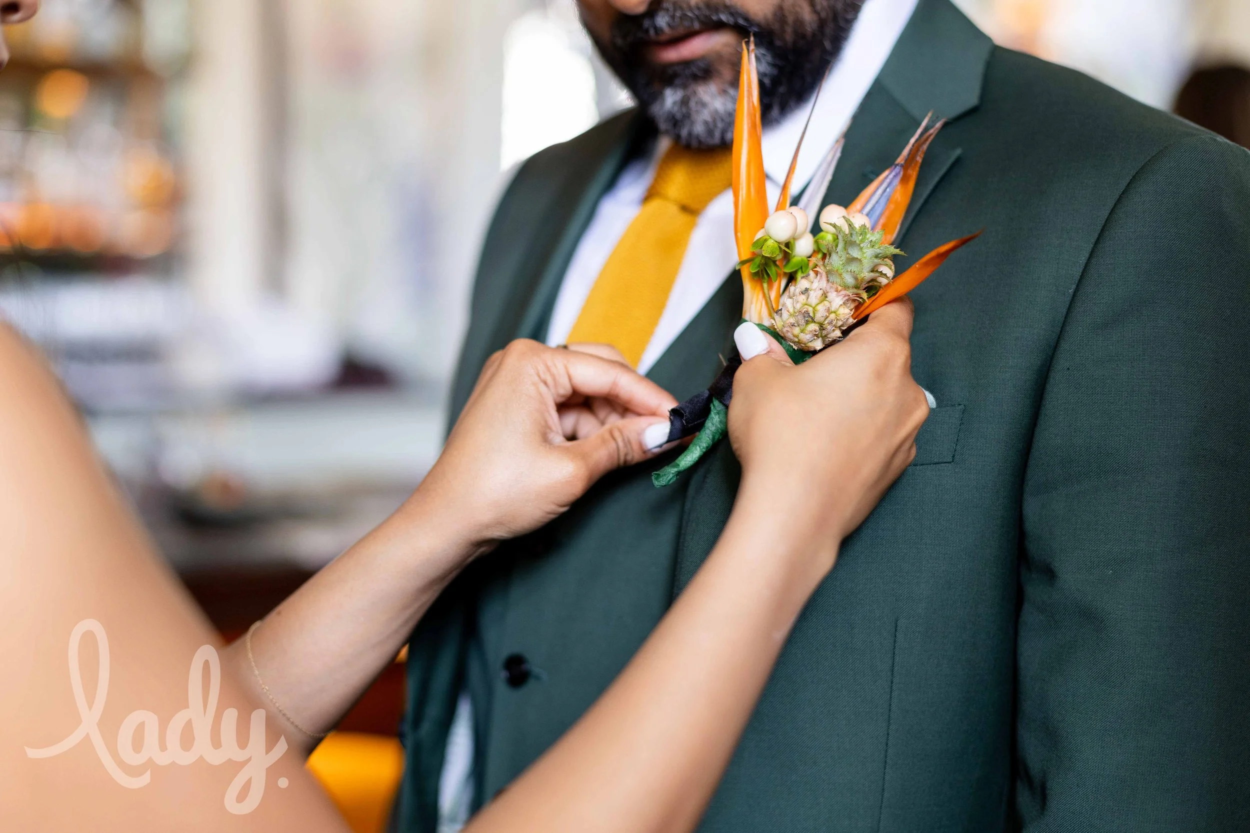 I found Stefan downstairs in the bar waiting for me to position him for their first look. I spotted him at a table but he was completely backlit and in that light his suit looked brown. For a moment I was like… wait… brown? There’s no way he’s wearing a brown suit! But as I got closer and I could see him better I saw that he was, in fact, not wearing a brown suit. It was that same deep green as Hawley’s shoes and I went from momentary panic to “YASSS QUEEN!” in about .02 seconds. I gave him the rundown of the plan and his sister, Anishka, joined us soon after to put on his boutineer. Which was, predictably, cool AF. If I ever tie the knot, I’m flying Hawley’s mom in to do my floral, too!
