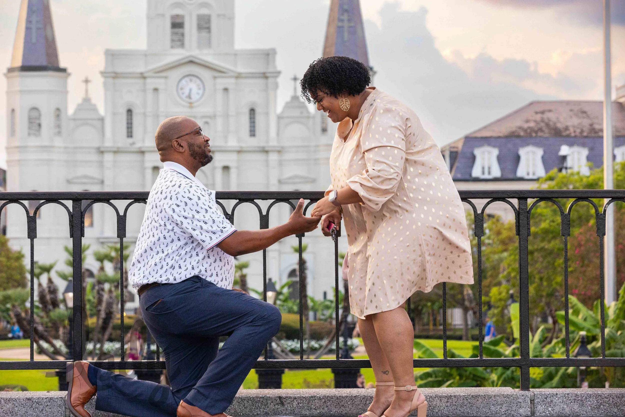 A man offers a ring to his girlfriend as he is on one knee in front of her overlooking Jackson square in New Orleans.  The woman is smiling, accepting his proposal.