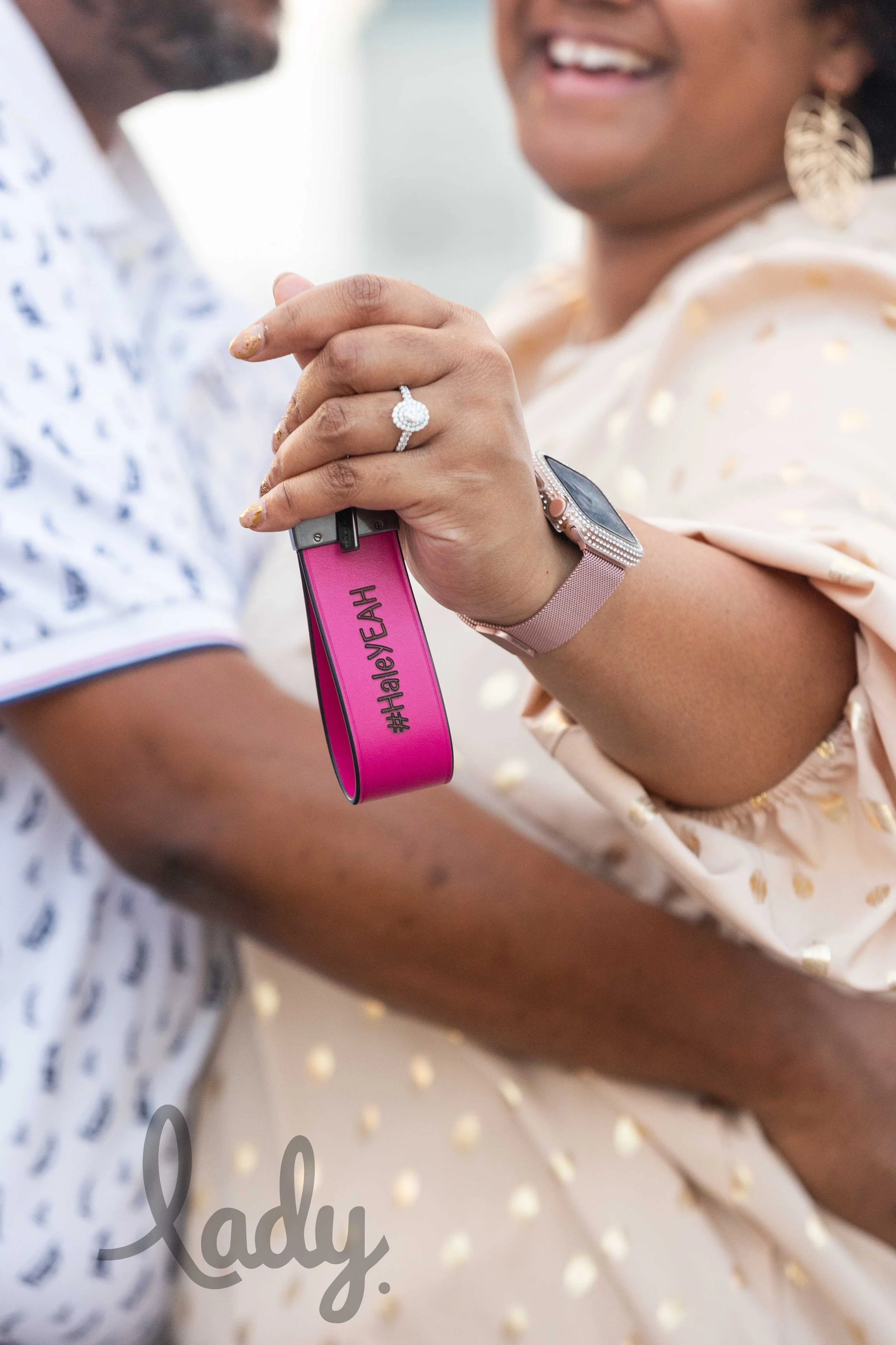 A closeup of a woman’s hands on the back of her fiance’s neck  and on his shoulder while she wears a new diamond engagement ring on one hand and holds a pink, leather, Coach keychain engraved with #haleyeah in the other. The background is St Louis C
