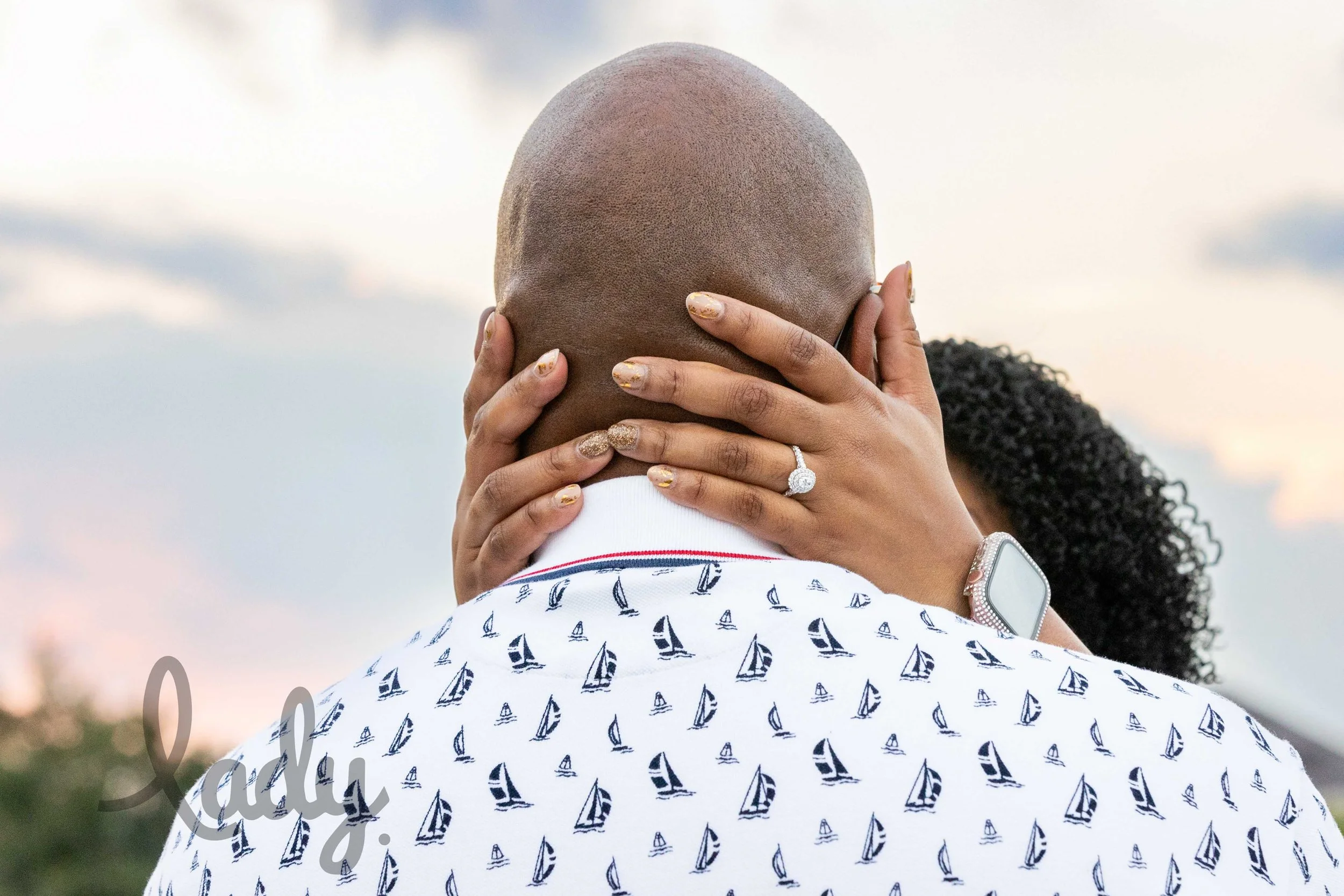 A closeup of a woman’s hands on the back of her fiance’s neck while she wears a new diamond engagement ring. The background is the sky at sunset.